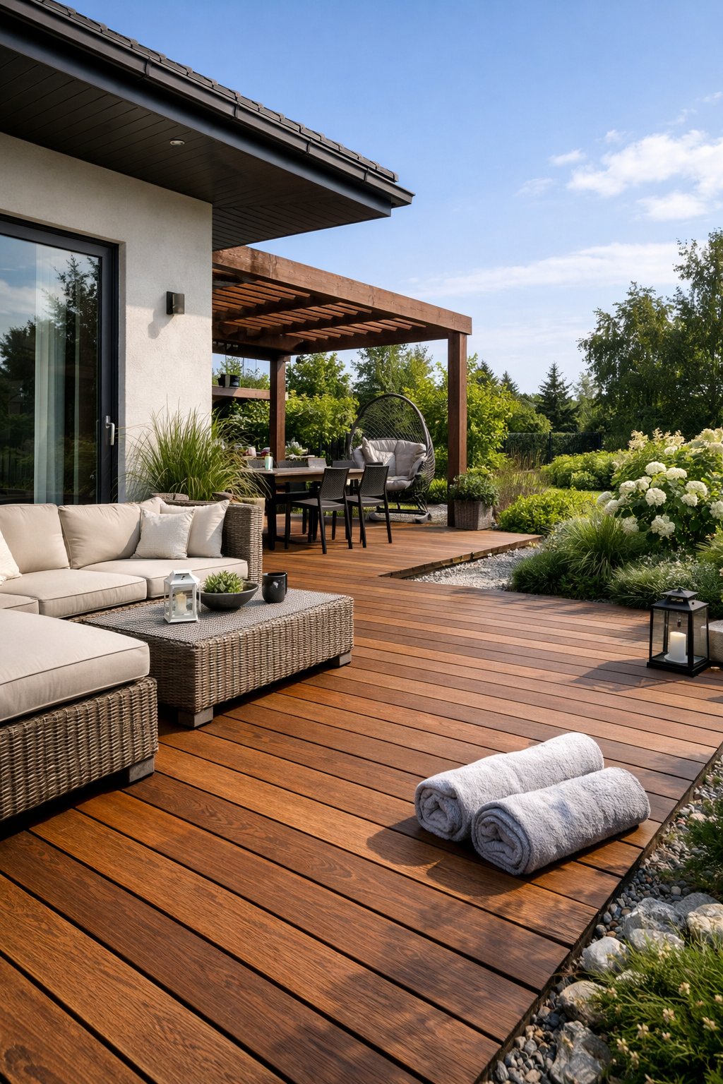 Współczesne projekty domów bardzo często zakładają, że deski na tarasie będą przedłużeniem strefy dziennej. Taras staje się wtedy integralną częścią przestrzeni mieszkalnej i miejscem wypoczynku przez większą część roku. W takich realizacjach ogromne znaczenie mają kolor, struktura oraz sposób wykończenia nawierzchni.